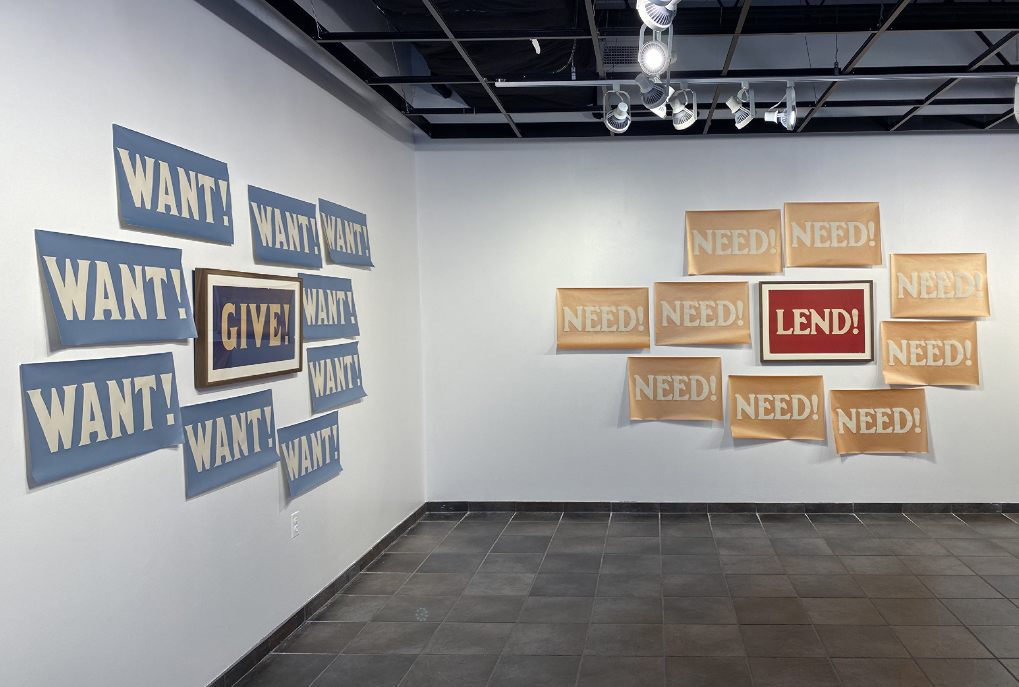 The simple one-word exhortations on these prints immediately reminded me of 21st-century social media, although the comparison was not flattering. Scanning an Instagram feed of an artist’s labors, it’s common to see tossed-off comments like “LOVE!” or “FIRE!”, “WANT!” or “NEED!” Especially taken in bulk, such effusive praise strikes me as a distressingly superficial kind of engagement. I suppose shallow art criticism is largely harmless. But this frantic model of connection is not unique to the cultural sphere. In the realm of electoral politics, social justice, or international warfare, the media we use to connect seem to offer us so much, but require so little.
